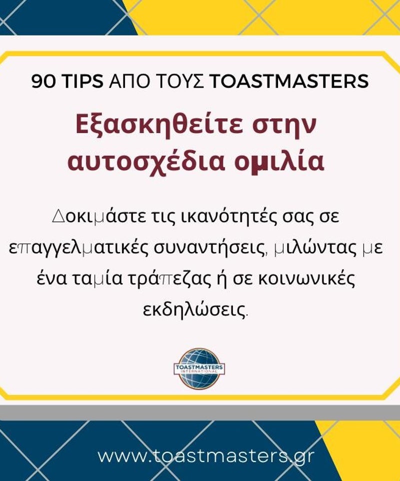 Οι Toastmasters International είναι ένας παγκόσμιος μη κερδοσκοπικός εκπαιδευτικός οργανισμός που λειτουργεί από το 1924. Η αποτελεσματική επικοινωνία, η δημόσια ομιλία, η ομαδικότητα, η αυτοηγεσία και οι δεξιότητες ηγεσίας αποτελούν τον πυρήνα της εκπαίδευσης των 280.000 μελών σε ομίλους πάνω από 144 χώρες σε όλο τον κόσμο.